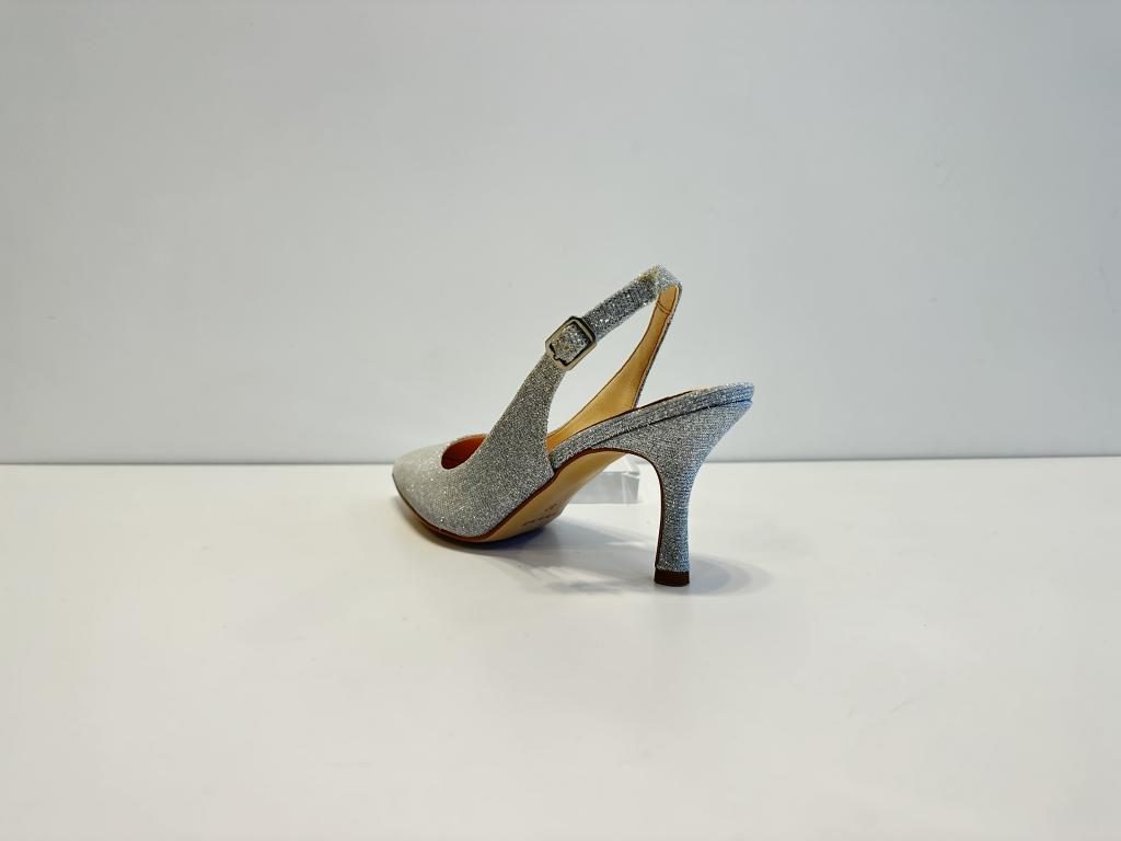 Chanel in tessuto glitterato argento con fodera e soletta in pelle e tacco di 8cm.