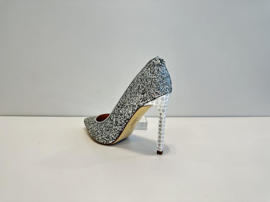 Decolleté Guess glitterato argento, fodera e soletta in pelle e tacco argentato di 11cm.