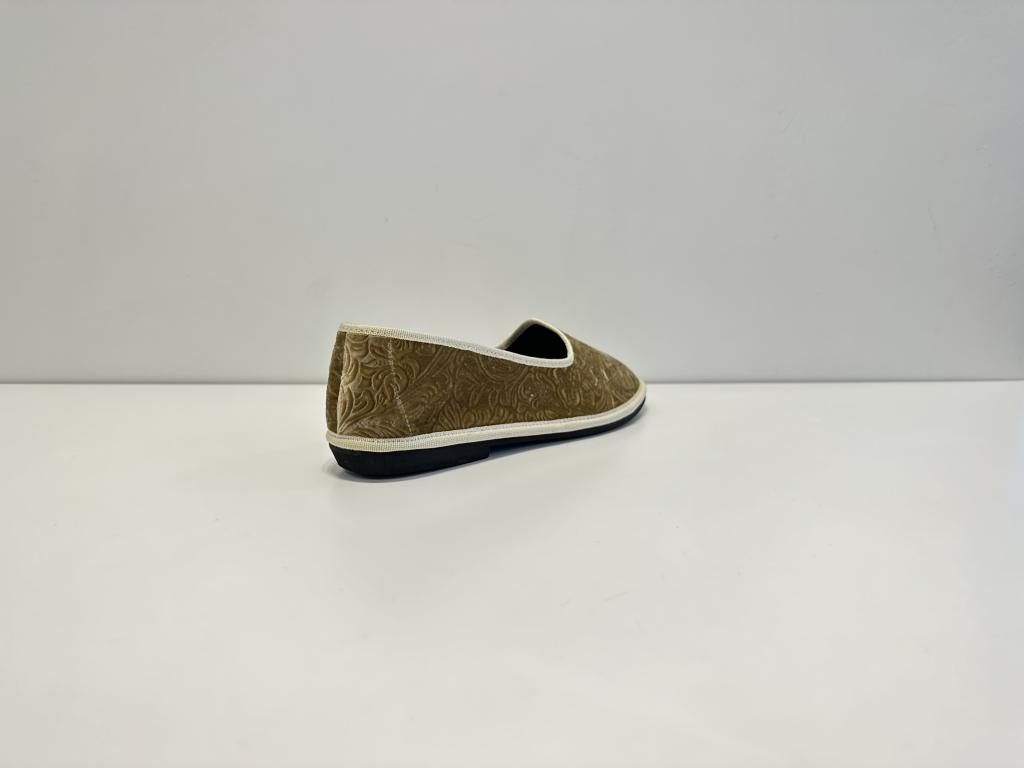 Friulana in velluto ricamato beige con rifiniture crema, fodera in tessuto, soletta in pelle e fondo in gomma con tacco di 1cm.