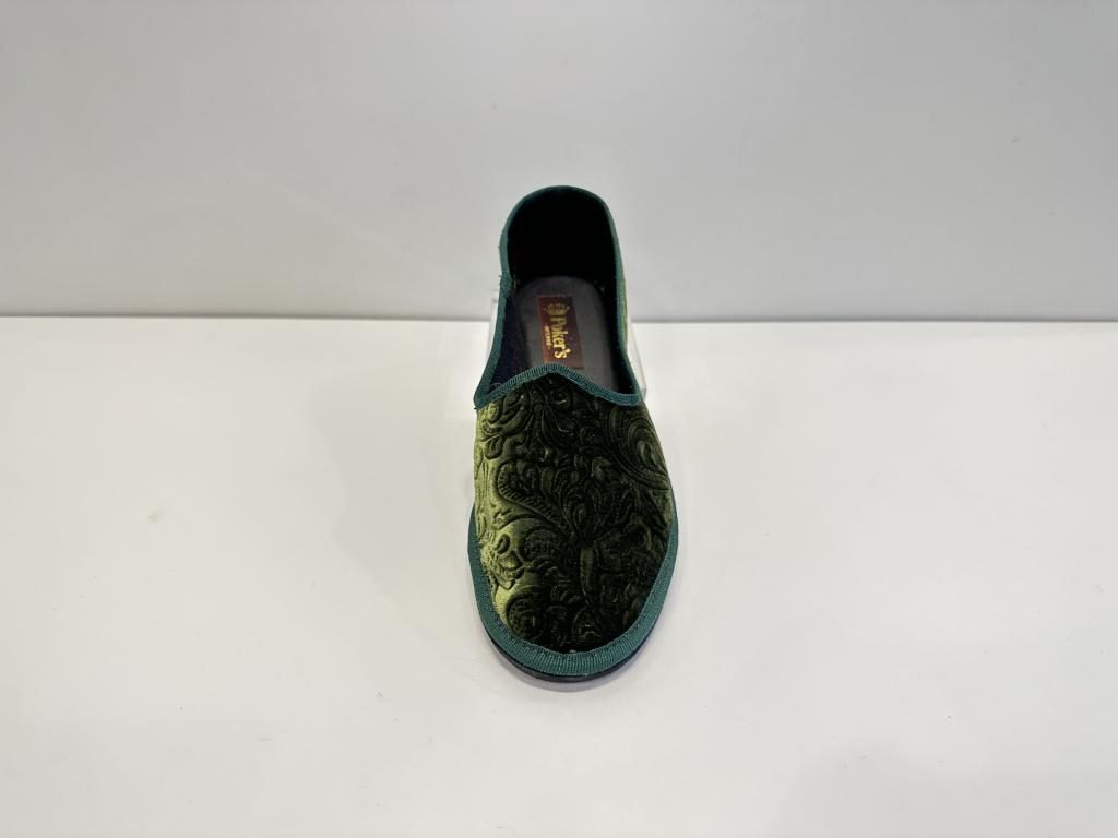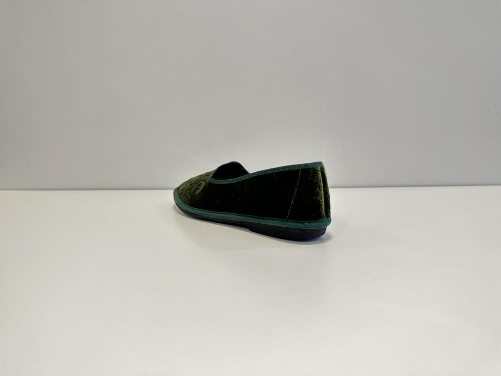 Friulana in velluto ricamato verde scuro con rifiniture verdi, fodera in tessuto, soletta in pelle e fondo in gomma con tacco di 1cm.