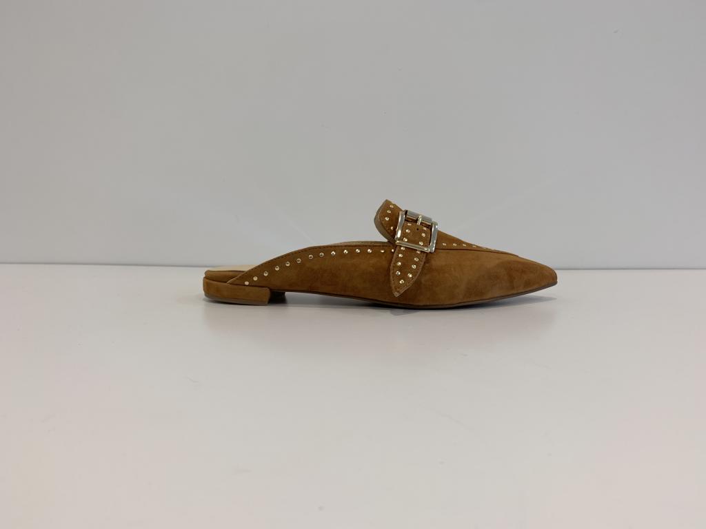 Sabot in camoscio “ruggine” con fibbia e borchie argento, fodera e soletta in pelle e tacco ricoperto di 2cm.