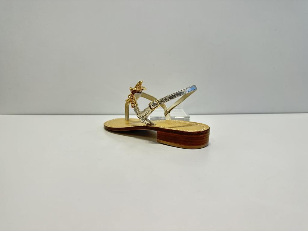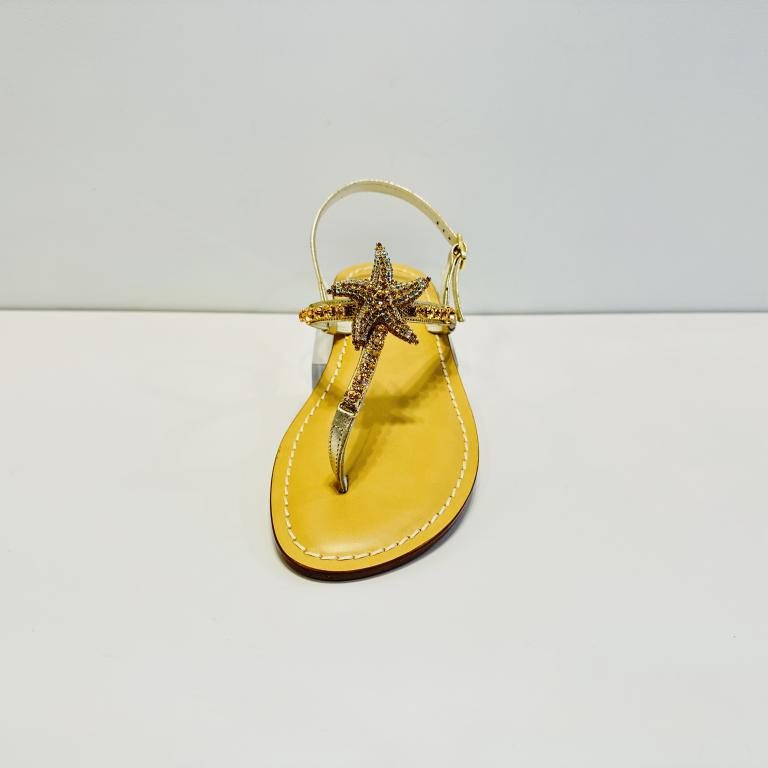 Sandalo infradito Moda Positano in pelle laminata platino, con strass in oro rosa e accessorio “stella marina” tempestato di strass rosa e oro. fodera e soletta cucita in pelle, fondo in cuoio e tacco di 2,5cm.